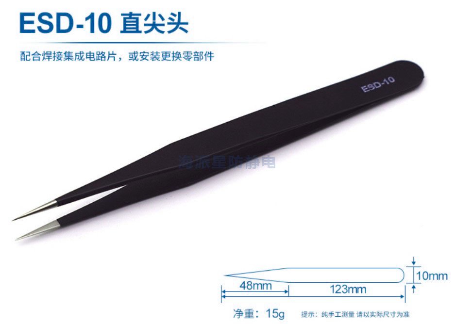 黑色防靜電鑷子,又叫半導(dǎo)體鑷子、導(dǎo)靜電鑷子,產(chǎn)品材質(zhì)由不銹鋼加導(dǎo)電碳黑制作而成,具有良好的硬度、彈性、耐酸堿、耐高溫,可有效泄放靜電電荷,使用方便、靈活,適用于半導(dǎo)體,IC等精密電子元件生產(chǎn)使用。