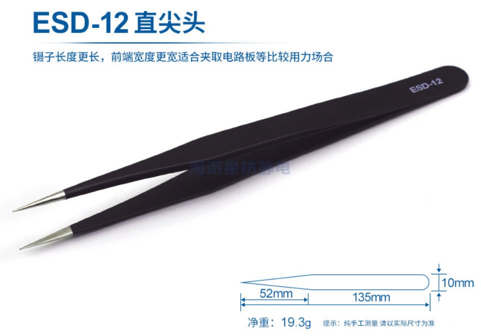 | ESD-12 | 鑷子長(zhǎng)度更長(zhǎng),前端寬度更寬,適合夾取電路板等比較用力場(chǎng)合 | ||||||